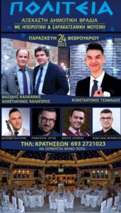 Αποκριάτικο Γλέντι στην Λυγιά Λευκάδας το Σάββατο 18 Φεβρουαρίου 2023 διοργανώνει ο Πολιτιστικός Επιμορφωτικός και Αθλητικός Σύλλογος Κατούνας στην ταβέρνα “Ο Γιάννης” με τους: Κώστα Μήτση, Γαλάνη Αλέξη, Βαγγέλη Ντζούφρα, Γιώργο Ζούμπα και στο κλαρίνο ο Κωνσταντίνος Λιόντος.