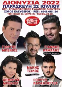 Home Πανηγύρι στα Δερβενοχώρια Βοιωτίας Πανηγύρι στα Δερβενοχώρια Βοιωτίας Πανηγύρι στα Δερβενοχώρια Βοιωτίας το Σάββατο 30 Ιουλίου 2022 στην ταβέρνα “Κρουσταλλενια” με τους: Βάσω Χατζή, Νίκο Τζούμα, Μαρία Τσαγανη και στο κλαρίνο ο Βαλάντης Μπέκος. Ετικέτες # Τζούμας# Χατζή Previous Post Πανηγύρι στον Διόνυσο Βοιωτίας Next Post Πανηγύρι στις Πηγές Καβάλας