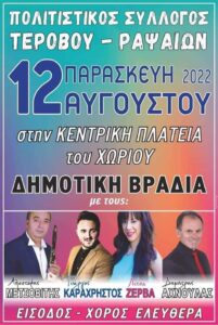 Πανηγύρι στα Πηγάδια Αιτωλοακαρνανίας το Σάββατο 13 Αυγούστου 2022 διοργανώνει ο Πολιτιστικός και Εξωραϊστικός Σύλλογος Πηγαδιών “Η Μανινα” με τους: Κώστα Μπανιωτη, Γιώργο Καραχρήστο, Ντίνα Αλεξοπούλου και στο κλαρίνο ο Αποστόλης Μετσοβίτης.