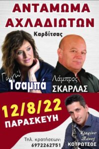 Πανηγύρι στα Τριανταίικα Αιτωλοακαρνανίας το Σάββατο 13 Αυγούστου 2022 με τους: Κώστα Αντωνίου, Ρία Ελληνίδου, Γεωργία Μουρτζιαπη και στο κλαρίνο ο Άρης Μουγκοπέτρος. Φιλική συμμετοχή ο Κωνσταντίνος Τσαμαδός.