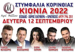 Πανηγύρι στην Στυμφαλία Κορινθίας την Τρίτη 13 Σεπτεμβρίου 2022 στο κέντρο “Αφοί Μάλλιου” με τους: Χαρά Βέρρα, Κώστα Σαφέτη, Κώστα Τσαρούχα και στο κλαρίνο ο Νεκτάριος Κοκκώνης