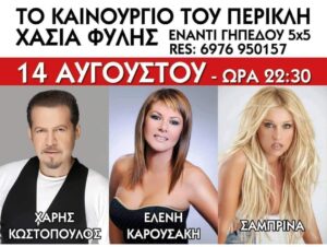 Πανηγύρι στην Χασιά Αττικής τη Δευτέρα 15 Αυγούστου 2022 στο κέντρο “Το Καινούργιο του Περικλή” με τους: Κώστα Σκαφίδα, Ζέτα Οικονόμου, Μιχάλη Μαραγκάκη, Μαρία Τσαγανη, Δημήτρη Αγγέλη, Λένα Βασιλείου και στο κλαρίνο ο Γιάννης Βασιλειάδης.