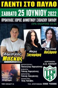 Πανηγύρι στις Αλυκές Καρυωτών Λευκάδας την Τετάρτη 22 Ιουνίου 2022 με τους : Γιάννη Καψάλη, Δημήτρη Τζίμα, Έλενα Γεωργαντά, Στέλλα Θάνου, Κώστα Παρούση και στο κλαρίνο ο Μάκης Τσίκος.