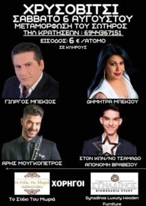 Πανηγύρι στον Μύτικα Πρεβέζης την Παρασκευή 12 Αυγούστου 2022 με τους: Γιώργο Βελισσάρη, Αγγελική Ηλιάδη, Δημήτρη Τζίμα, Έλενα Γεωργαντά.