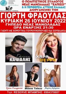 Πανηγύρι στον Μύτικα Πρεβέζης την Παρασκευή 24 Ιουνίου 2022 διοργανώνει ο Περιβαλοντολογικός Πολιτιστικός Σύλλογος Μύτικα ” Ο Μύτικας” με τους: Διαλεχτή, Γιώργο Καψάλη και στο κλαρίνο ο Αποστόλης Μετσοβίτης, στο λαϊκό πρόγραμμα οι Στέλιος Ποικλης και Μαυρομάτη Ειρήνη