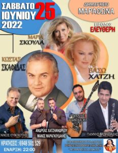 Μαζί μας η ορχήστρα της ερμηνεύτριας Νάντιας Καραγιάννη με δημοτικά, νησιώτικα, ρεμπέτικα και λαϊκά τραγούδια. Την πλαισιώνουν ο Νίκος Καραγιάννης στην κιθάρα και το τραγούδι, ο Κώστας Δήμου στο κλαρίνο, ο Νίκος Κρέτσης στο μπουζούκι και το λαούτο, ο Σπύρος Νίκας στο ακορντεόν και ο Λάζαρος Ακριβόπουλος στα κρουστά.
